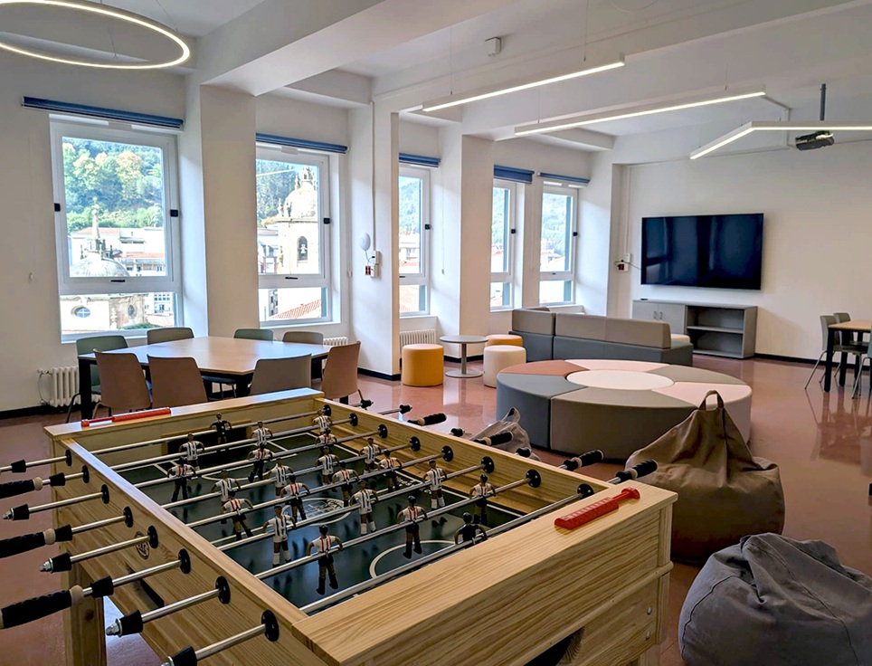 El espacio estará dotado con mobiliario (mesas, sillones, puff, baldas, etcétera) y con elementos de juego y ocio como un futbolín, un ping pong, una diana y dardos, juegos de mesa, revistas, una pantalla de televisión de 86 pulgadas, entre otros elementos.