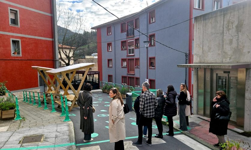 A continuación, se desarrolló la justificación técnica liderada por el Ayuntamiento, con el acompañamiento presencial de TECNALIA y Mondragon Unibertsitatea. Por la tarde, el equipo municipal, el equipo técnico y las representantes de la Comisión Europea recorrieron sobre el terreno las principales actuaciones en Santa Ana. Visitaron la Oficina de Barrio, punto de conexión permanente con la ciudadanía; las inmediaciones de Eskolabarri, donde la instalación fotovoltaica ha impulsado una comunidad energética que integra hogares, comercios locales y el propio centro escolar; y la renovación del edificio público Aldapakua, ejecutada por participantes del curso de construcción energéticamente eficiente del proyecto. También comprobaron la transformación, mediante procesos de co-creación y diseños votados por el vecindario, de dos espacios públicos en plazas más funcionales y acogedoras, así como el diseño comunitario de una medianera.