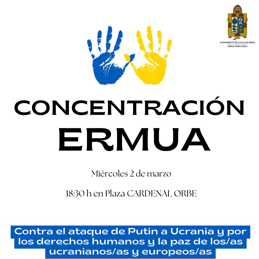 ERMUA | El Ayuntamiento de Ermua ha acordado en Junta de Portavoces celebrada en el día de hoy hacer un llamamiento a la concentración en contra del ataque de Putin y en favor de los derechos humanos y de la paz de l@s ucranianos y eropeos.