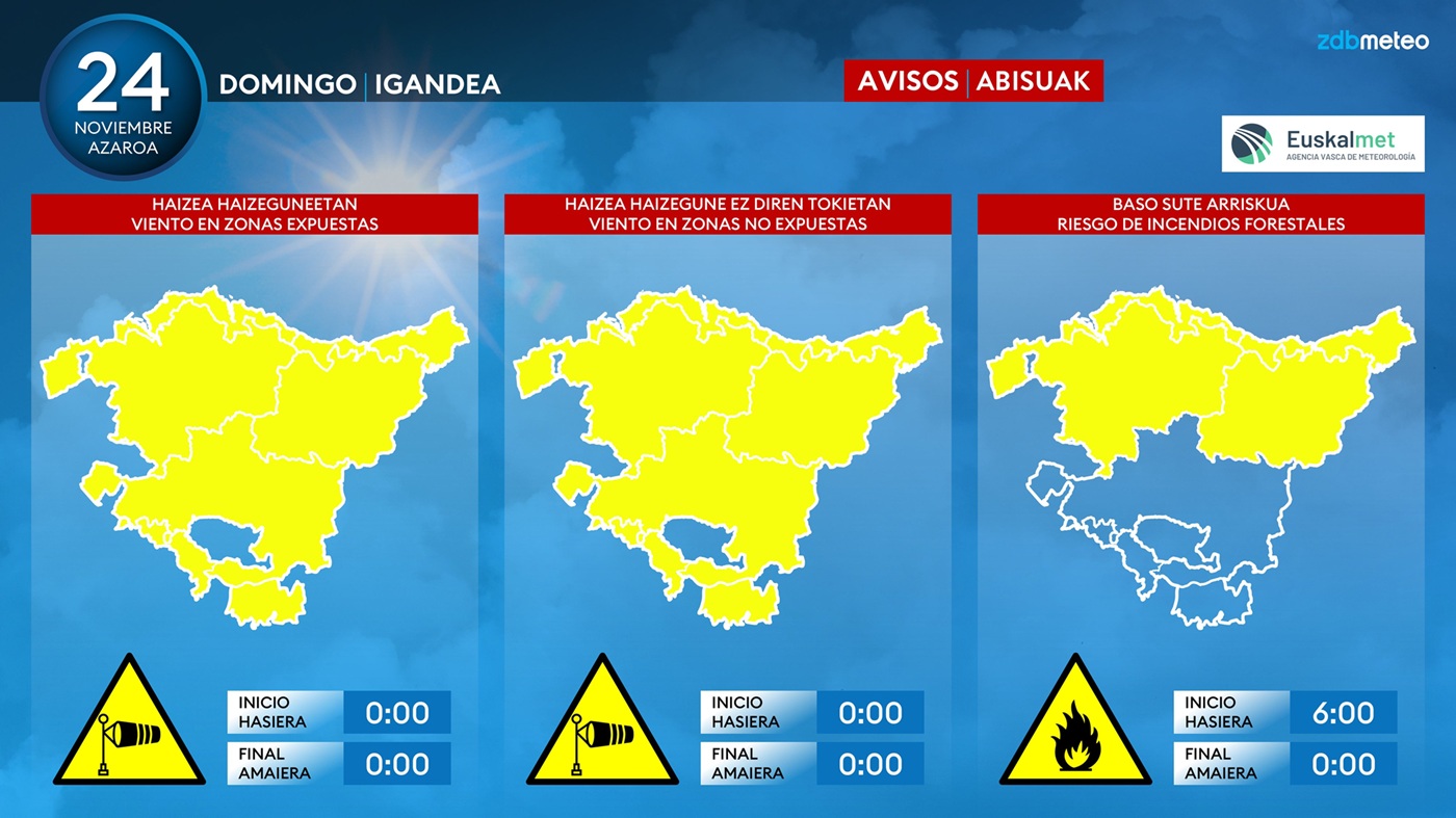 Además se ha activad el aviso amarillo también por riesgo de incendios forestales durante el domingo desde las seis de la mañana hasta la medionoche debido a la intensidad del viento.