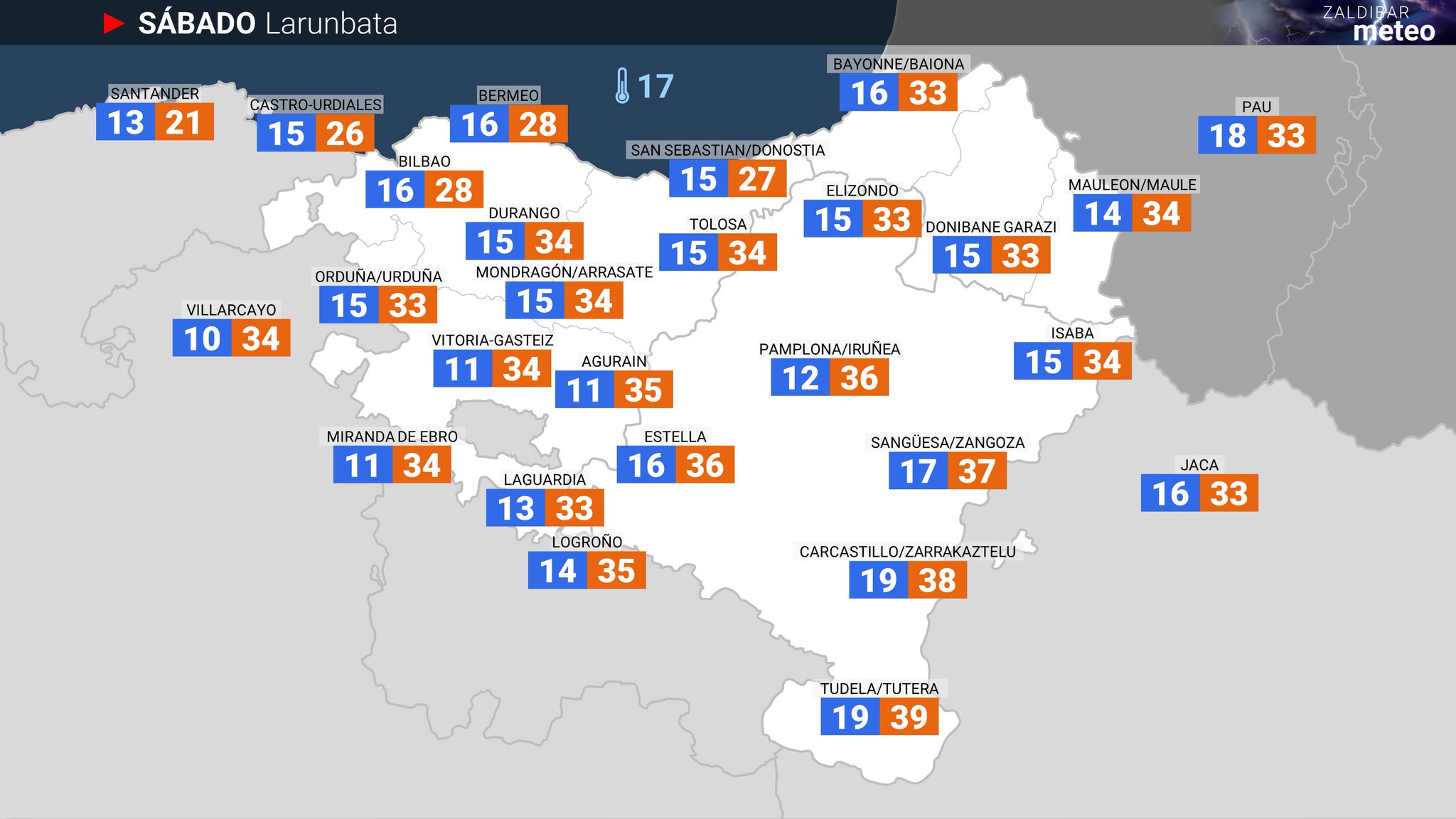 EGURALDIA | Ambiente muy caluroso para el sábado. Las temperaturas subirán de manera acusada, donde las máximas superarán los 30 grados, llegando incluso a los 35/36 grados. La sensación de bochorno será alta, con predominio de nubes medias y altas. También se espera algo de calima. Soplará este y a ratos el noreste. Al final del día podrían arreciar los vientos del oeste. No se descarta algún chubasco de origen tormentoso por la tarde-noche.