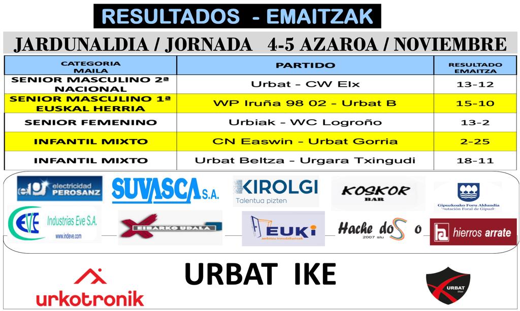 EIKIROLAK| Ha sido un fin de semana intenso para las diferentes categorías de los equipos de Urbat Urkotronik, con victorias del Senior A masculino y el equipo femenino A además de los equipos de categorías infantiles y la derrota al femenino B.