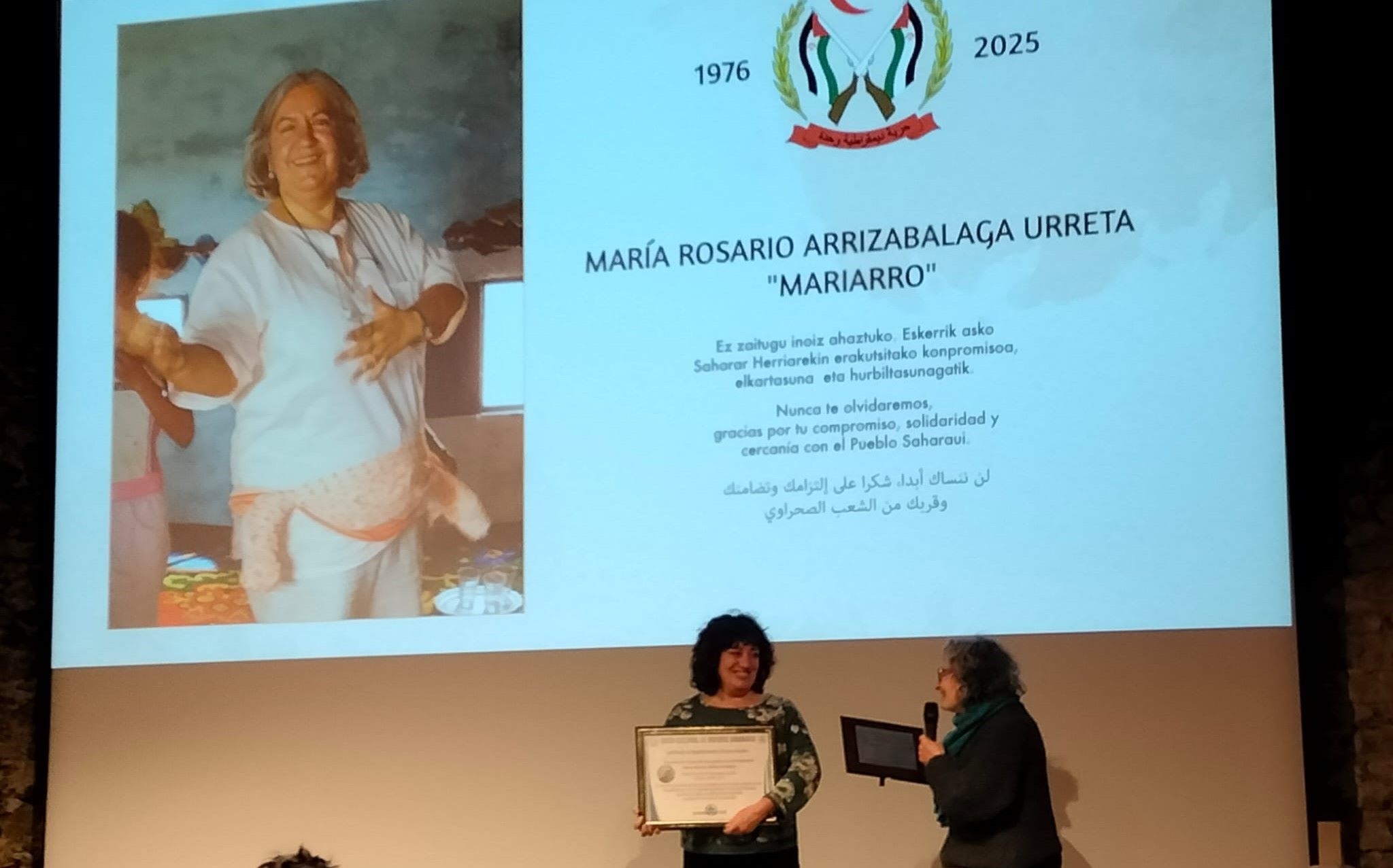 En este homenaje se ha reconocido el trabajo en favor del pueblo saharaui que llevó a cabo Maria Rosario Arrizabalaga hasta que falleció en el año 2021, y muy especialmente se ha destacado su iniciativa e impulso decisivo para crear una red de casas de las mujeres en los campamentos de refugiados.