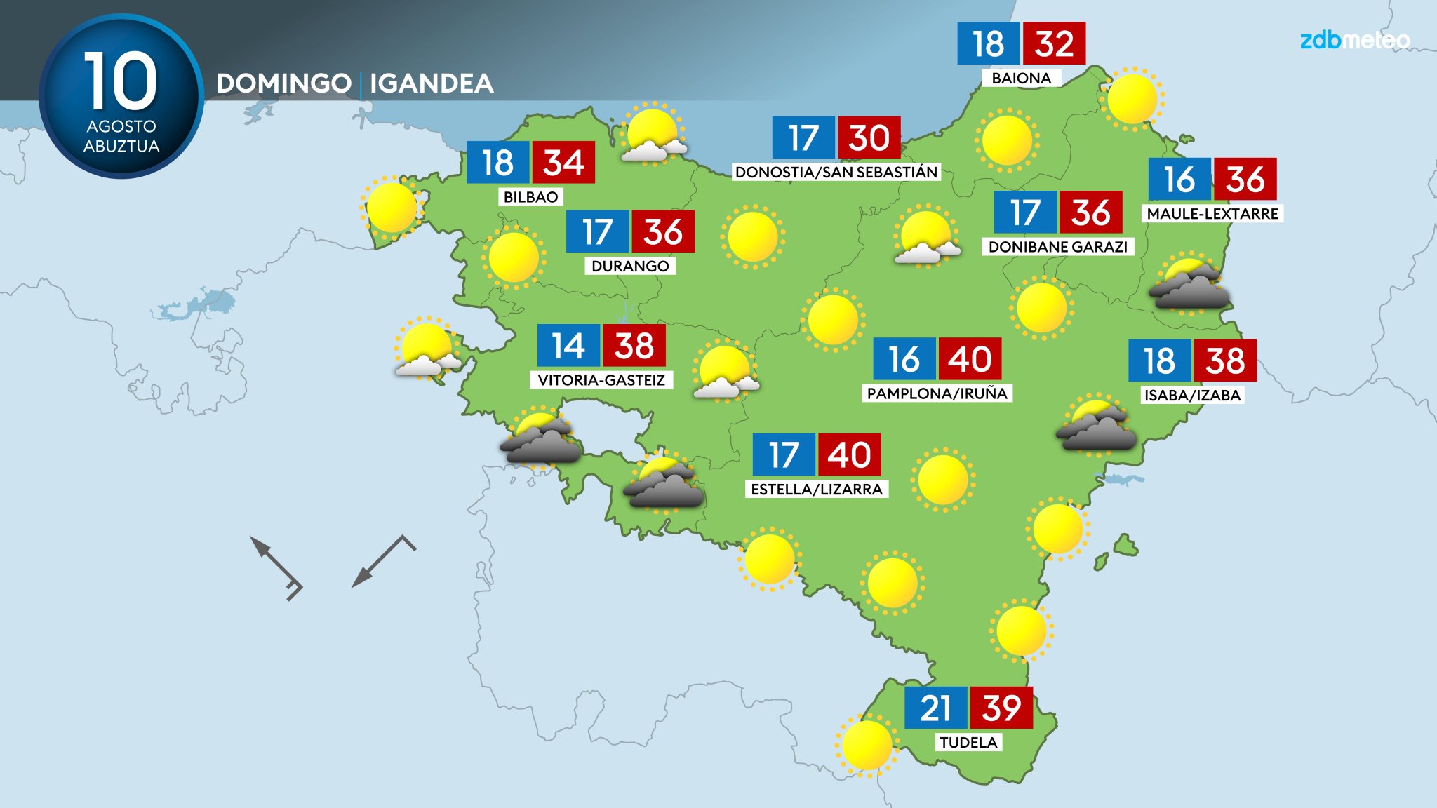 Según la Agencia Vasca de Meteorología, Euskalmet, este domingo, el calor será intenso, especialmente en el interior. La entrada de viento del nordeste frenará los termómetros en la costa, donde las temperaturas máximas podrían rondar los 28-30 ºC. En el interior soplará el viento de dirección variable, predominando el sureste a primeras horas de la mañana, lo que favorecerá una subida importante de las temperaturas diurnas. Durante la mañana el viento se irá fijando del nordeste, por lo que las máximas podrían alcanzar los 32-35 ºC en el interior de la vertiente cantábrica, pudiendo ser ligeramente más bajas en zonas donde llegue antes el flujo del nordeste, sobre todo en Gipuzkoa, y ligeramente más altas en el resto, sobre todo en Bizkaia.