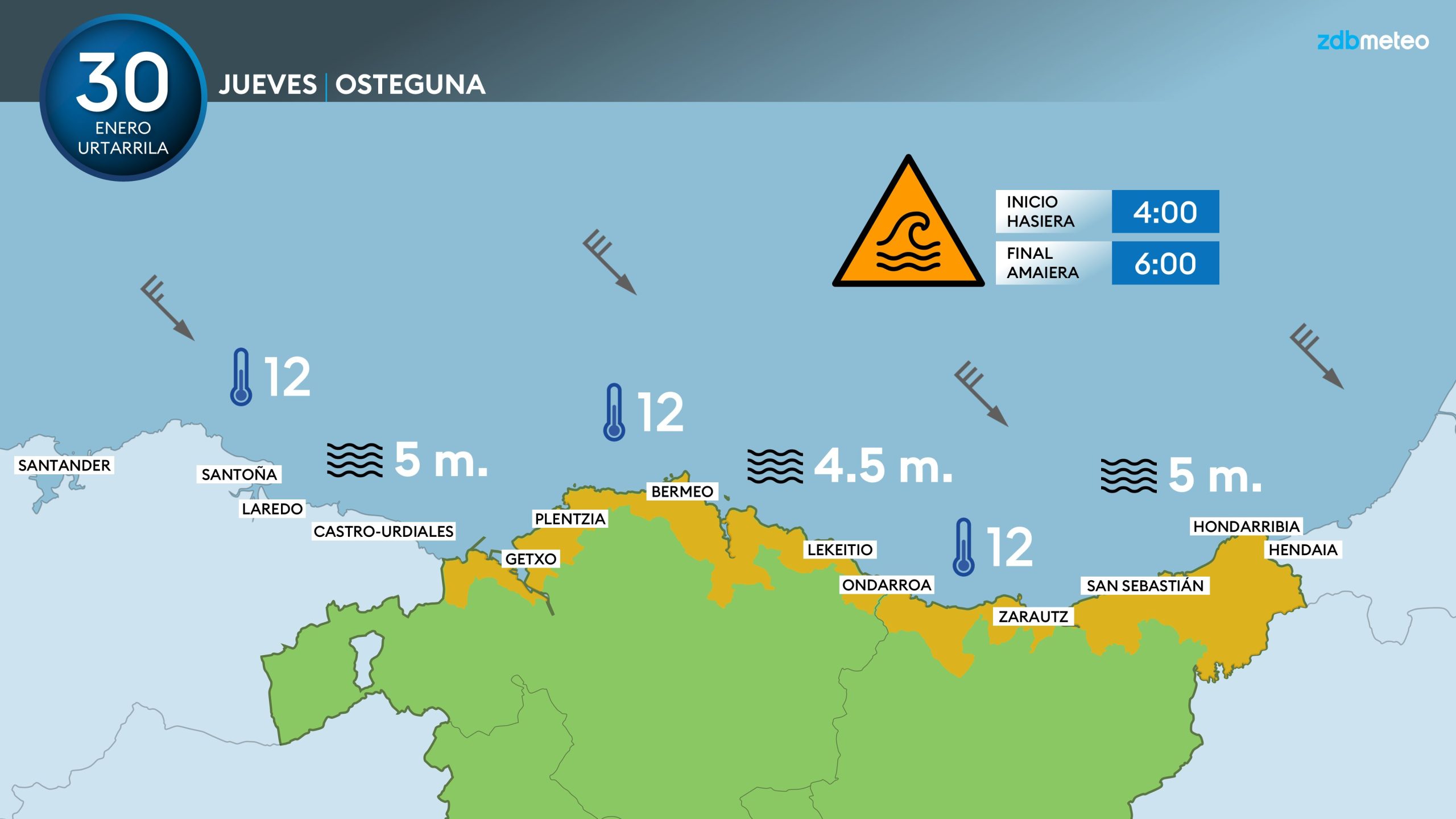 EGURALDIA | La borrasca ‘Ivo’ impactará de lleno este jueves en Durangaldea. Será un día muy invernal, con El jueves tiempo invernal y desapacible, con lluvia y fuerte viento del norte. La lluvia será abundante y nos acompañará durante buena parte del día; además en algunos momentos los chubascos pueden ser tormentosos y venir acompañados de granizo. El viento rolará a noroeste y soplará con fuerza, sobre todo en puntos próximos a la costa. La cota de nieve rondará los 1000 m y las temperaturas descenderán, con máximas entre los 7-13 grados en gran parte del territorio.