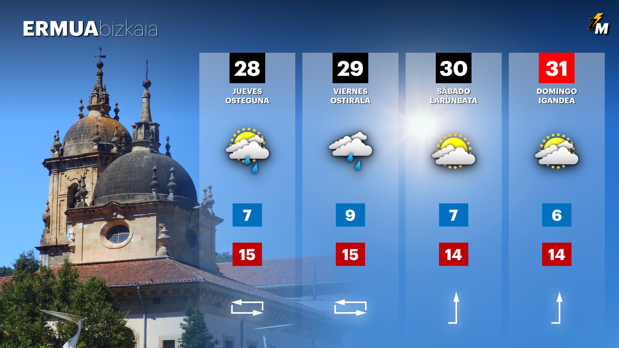 EGURALDIA | Abundante nubosidad de tipo medio y alto para el jueves; a partir del mediodía también aparecerán algunas nubes bajas y podría llover de manera débil y dispersa por la tarde. El viento seguirá soplando del sur, aunque irá perdiendo fuerza a lo largo del día; por ello y también debido a la mayor nubosidad, las temperaturas máximas bajarán un poco.
