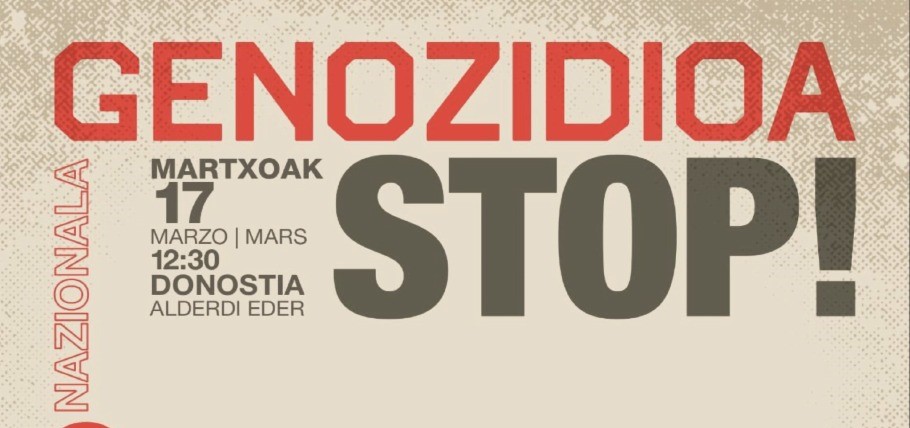 Esta dinámica, denominada ‘Kulturatik Stop Genocidio’, busca expresar solidaridad con el pueblo palestino y reclamar el fin del genocidio, para lo que reclama a los dirigentes y políticos el cese de todas las relaciones comerciales, militares y diplomáticas con Israel.