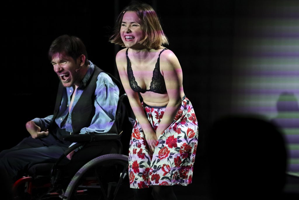 Aitziber Garmendia y Telmo Irureta son los actores que escenifican las vivencias y emociones de un chico con parálisis cerebral y se centra activamente en el aspecto afectivo-sexual