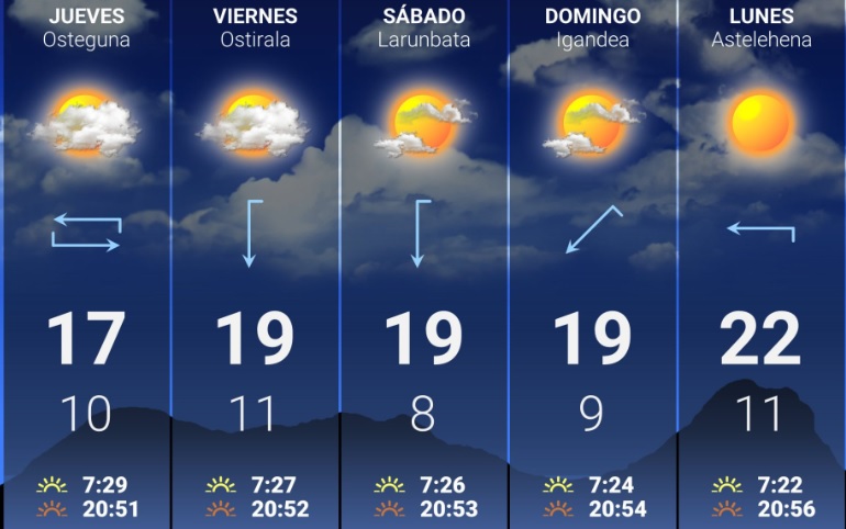 Según Euskalmet, a partir de esta jornada y, sobre todo del jueves, el tiempo tenderá a estabilizarse, si bien se espera la llegada de vientos del este-nordeste que podrían acarrear algunos intervalos nubosos, sobre todo durante las jornadas del jueves y viernes, aunque a partir del sábado y hasta el lunes es menos probable que llegue esta nubosidad con lo que los claros serán amplios.