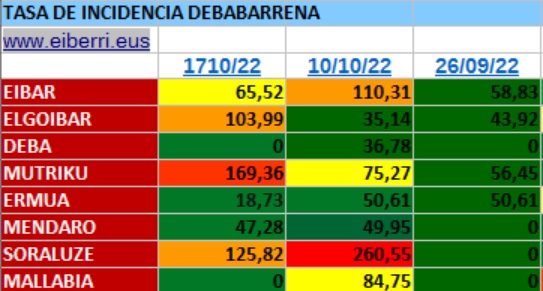 DEBABARRENA | La situación no mejora en la comarca con respecto a la semana anterior. Varios municipios siguen sin poder bajar a la zona verde, como Eibar o Soraluze, mientras Elgoibar sube directamente a la zona naranja esta semana. El resto se mantiene en el verde. Todo ello después de los 61 nuevos casos resgistrados durante los últimos siete días.