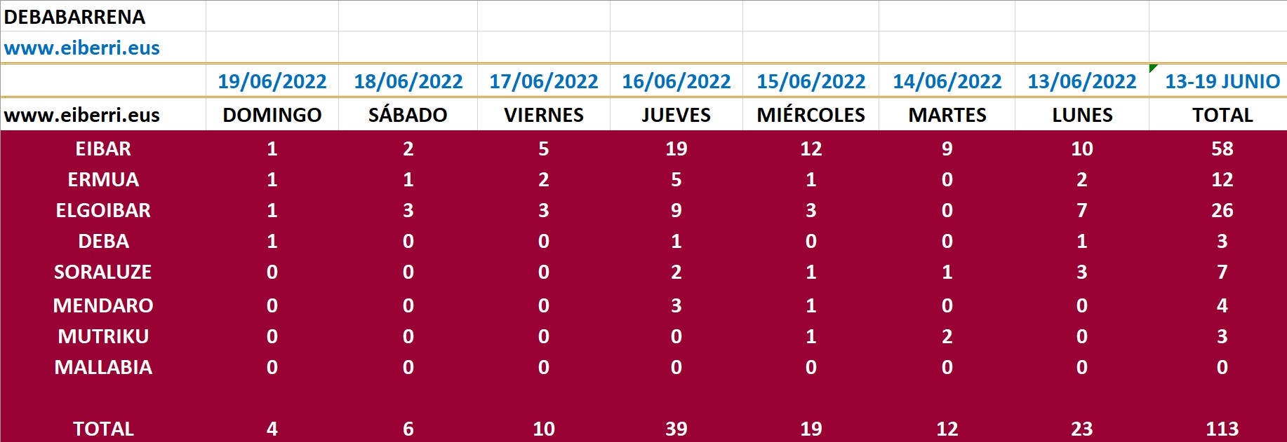 DEBABARRENA| Durante la semana del 13 al 18 de junio han sido 113 los casos positivos detectados en Debabarrena, mientras que la semana anterior fueron 99. Por localidades 58 se han registrado en Eibar, en Elgoibar 26, en Ermua 12, en Soraluze 7, en Mendaro 4 y en Mutriku y Deba 3 en cada.