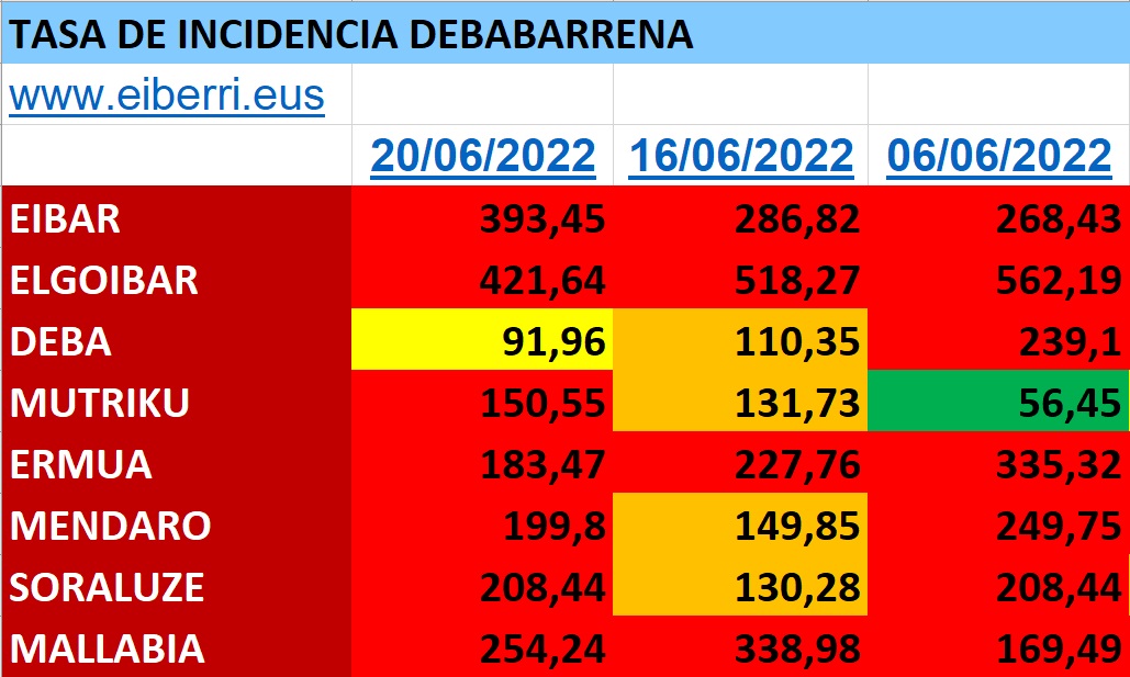 La tasa de incidencia vuelve a ser roja excepto en Deba que ha descendidoa a 91,96.