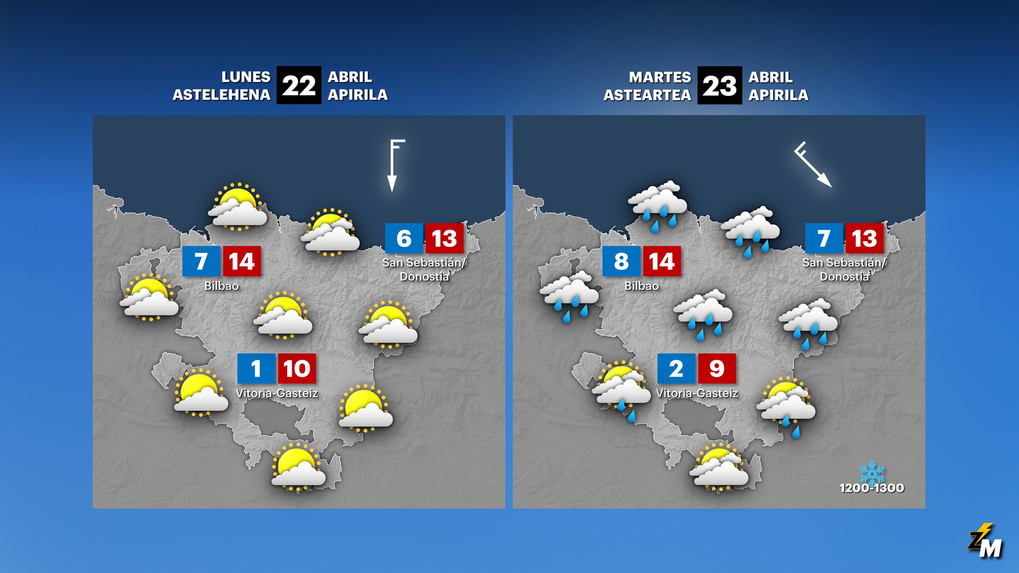 El martes cielos cubiertos y precipitaciones. Temperaturas con pocos cambios, máximas entre los 10-13 ºC, y cota de nieve rondando los 1000-1200 metros. Viento del norte y del noroeste algo intenso.