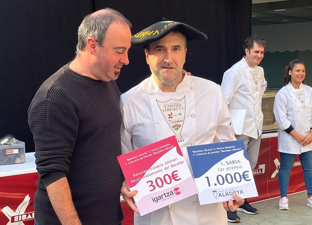 EIBAR | Los hermanos Kortabitarte han vuelto a sumar un nuevo premio, en esta ocasión en Eibar. Este sábado se celebraba una nuevo edición del Concurso Bacalaos Alkorta, enmarcado en las fiestas de San Andrés. Para la ocasión los durangarras presentaban el pintxo «Bocalao, un bocado de bacalao», con el que han lograban alzarse con el primer premio. En el certamen participaban los ganadores de Navarra, Araba, Bizkaia y Gipuzkoa. También de Eibar, Ermua y Elgoibar, por la comarca de Debabarrena.