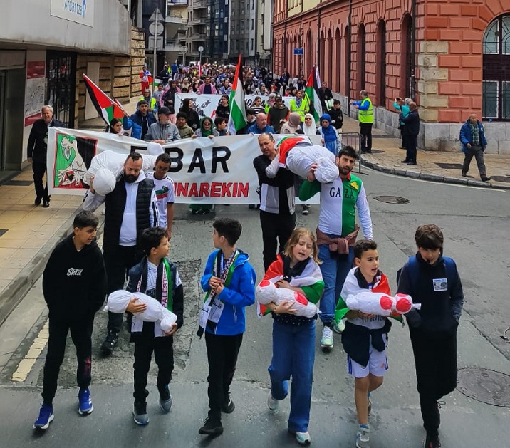 En el acto que ha tenido lugar al final de la marcha ha actuado el músico Patxi Dinamita y se han hecho sonar sirenas para evocar la alerta por los bombardeos que padecen cada día desde hace 8 meses la población de Gaza, mientras se mostraban imágenes representativas de las casi 40.000 personas asesinadas por las bombas israelíes durante este tiempo.