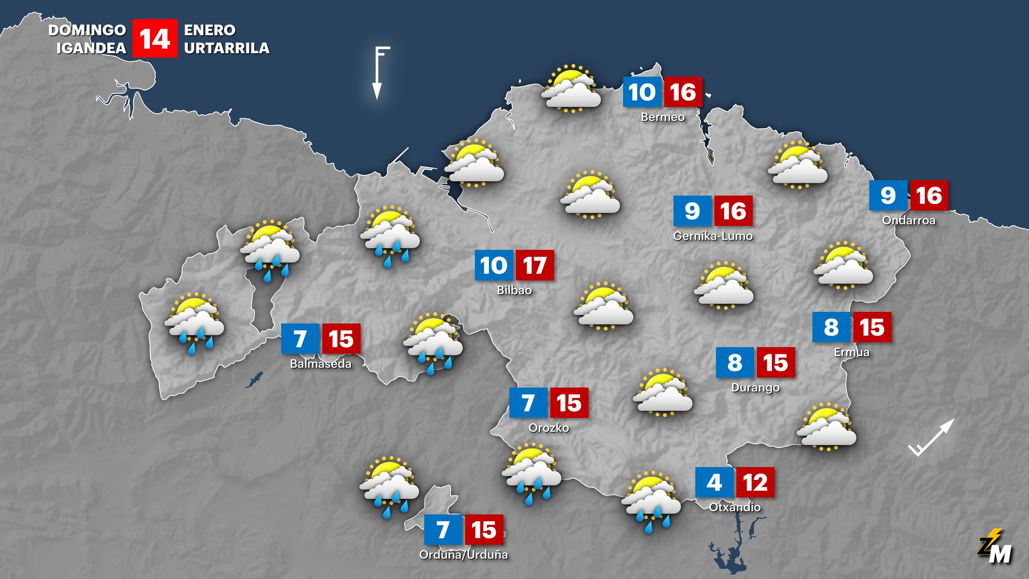 EGURALDIA | El domingo por la mañana las nubes irán ganando terreno y durante las horas centrales el cielo quedará muy nuboso. Precipitaciones a partir de la mañana; serán débiles en general, aunque ocasionalmente puede llover con algo más de fuerza, sobre todo por la tarde. Viento sur, predominando el suroeste, con algunas rachas fuertes en zonas altas; por la tarde soplará del oeste-noroeste en la costa. Temperaturas diurnas en ascenso sin demasiados cambios.