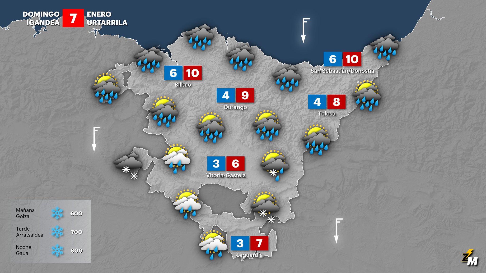 EGURALDIA | El domingo seguiremos con chubascos y ambiente frío. Las precipitaciones serán menos abundantes en general que la jornada anterior, aun así, seguiremos con chubascos intermitentes que irán entrando desde el mar y que nos acompañarán durante toda la jornada, siendo más frecuentes en la mitad norte y durante la primera mitad del día. El viento soplará de componente norte y las temperaturas no variarán mucho, con la cota de nieve rondando los 700-900 metros.