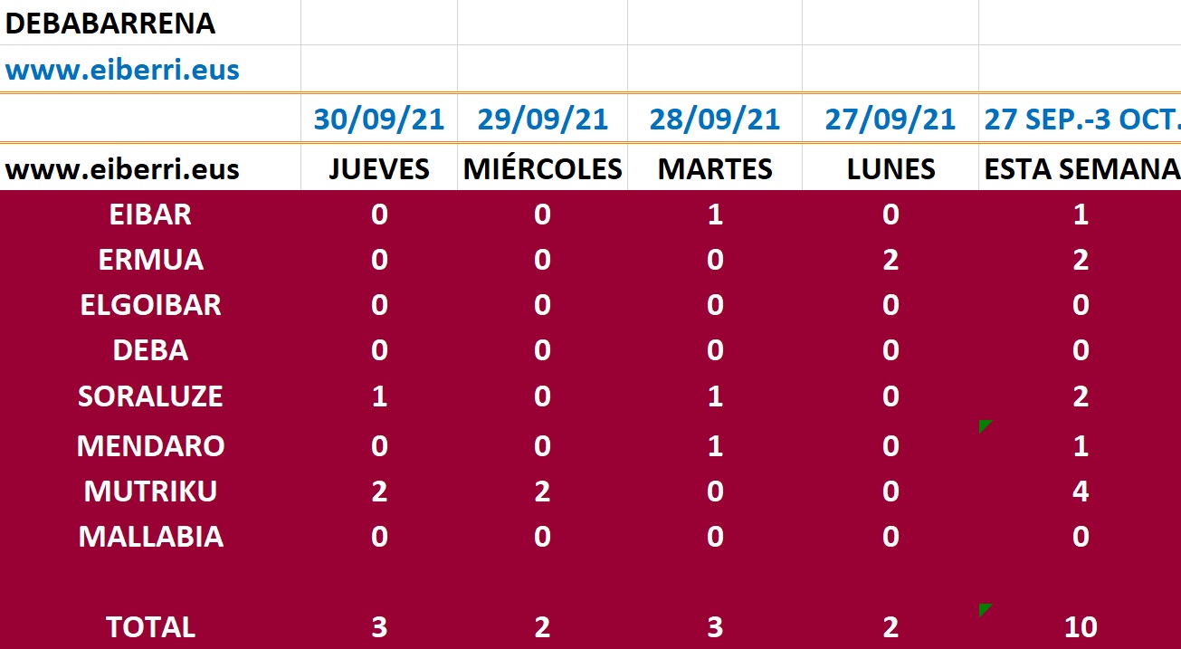 DEBABARRENA.– La situación pandémica en Debabarrena sigue controlada y a excepción de los 2 casos de Mutriku y el caso de Soraluze, en el resto de municipios no se han detectado casos.