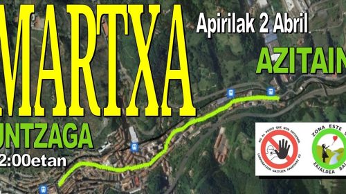 EIBAR | La Asociación vecinal No al paseo que nos entierra-Ekialdea Bai ha organizado una marcha vecinal para el día 2 de abril, sábado, a las 12:00 horas. La marcha comenzará en la plaza de Untzaga, trascurrirá por las calles Toribio Etxeberria, Errebal, Arragueta, parque de Urkizu, Barakaldo, Barrena y Azitain hasta llegar a la entrada/salida de la autopista.