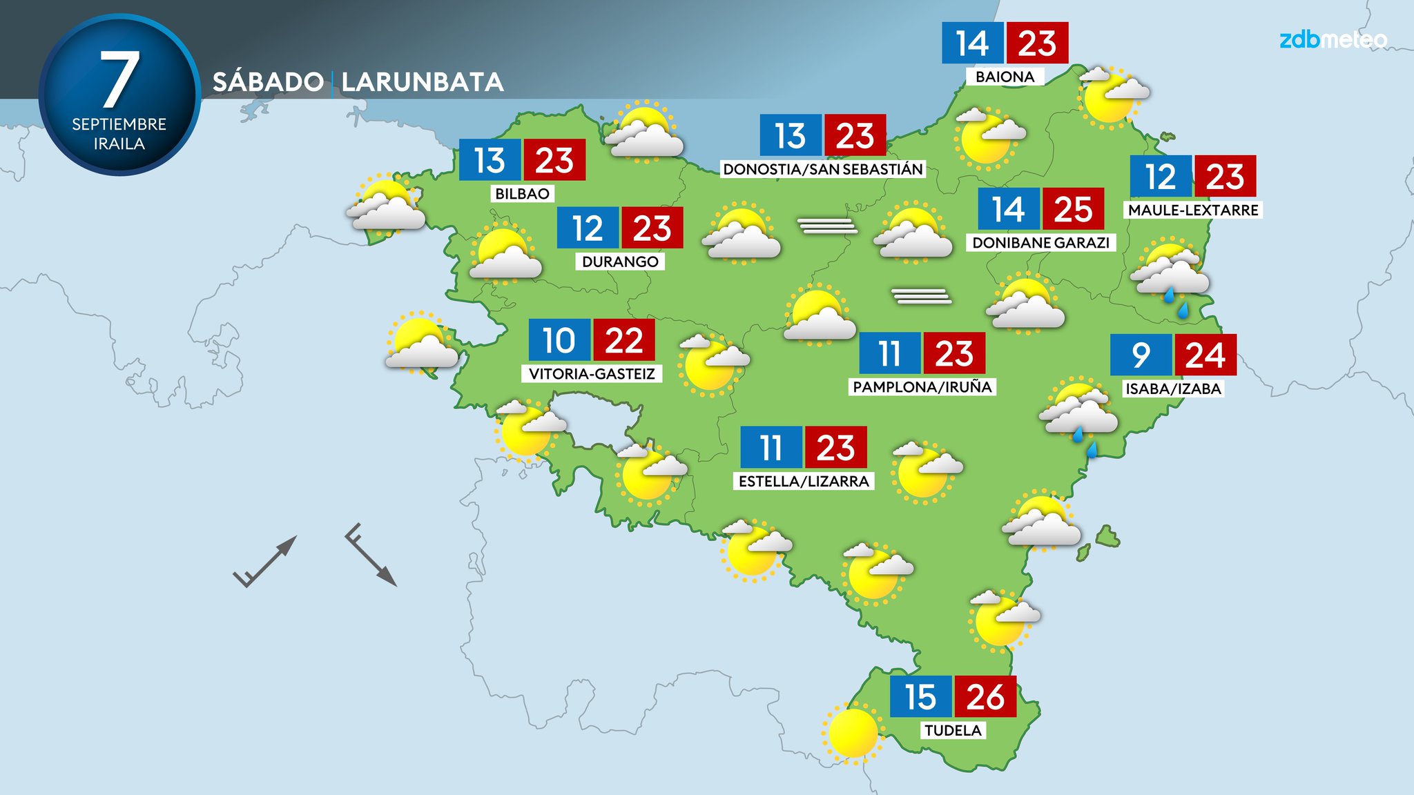 EGURALDIA | El sábado el tiempo será más tranquilo y la probabilidad de lluvia será menor. Tendremos nubosidad variable, con muchos ratos soleados, pero sin descartar algún chubasco, especialmente de madrugada y primeras horas. El viento soplará del suroeste y después tenderá componente norte. Las temperaturas podrían subir un poco más.
