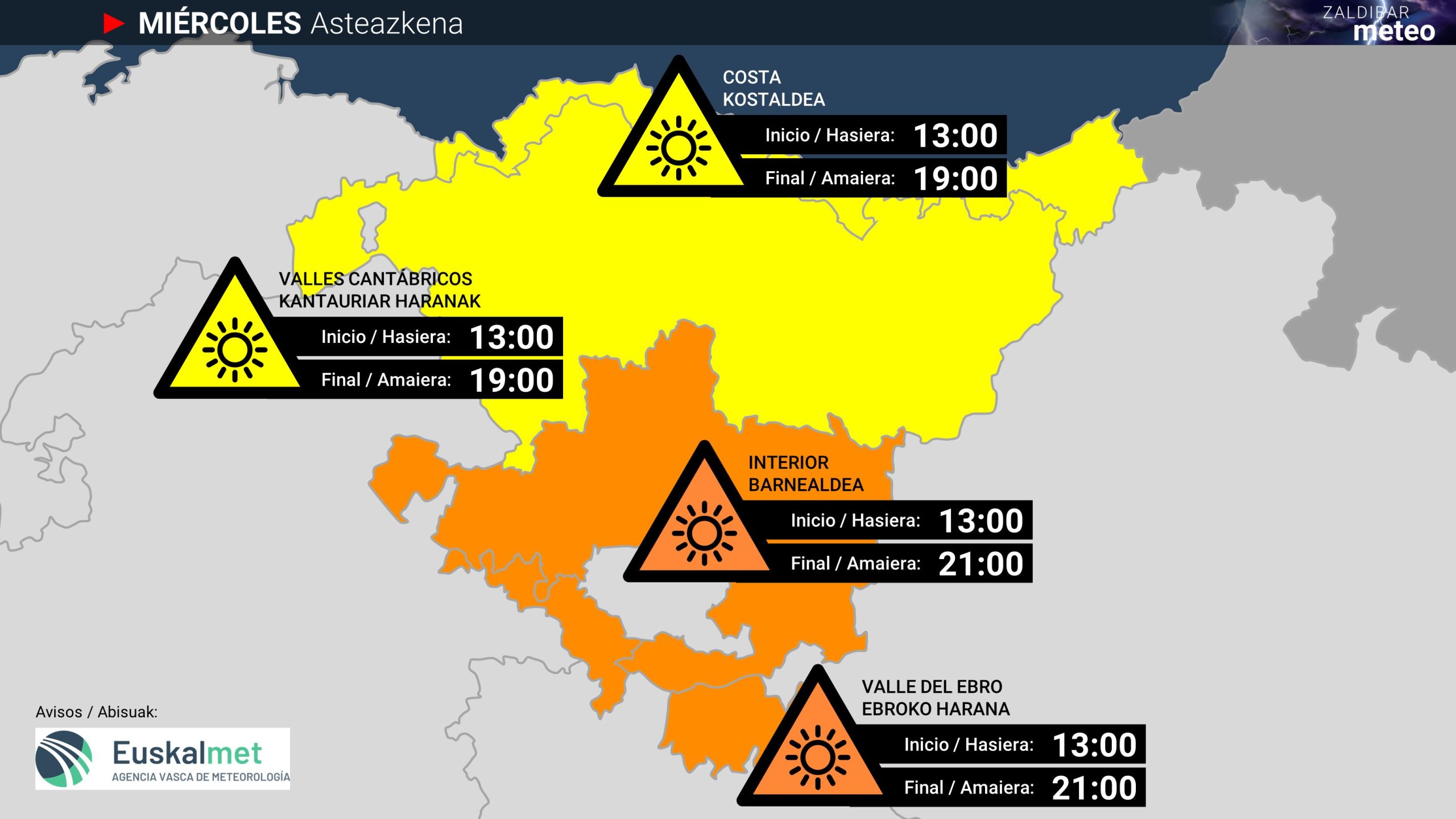 EGURALDIA | El calor apretará aún más el miércoles. Esperamos una jornada de cielos despejados y ambiente tórrido, sobre todo en el interior, donde las máximas se situarán entre los 35 y los 40 grados. En la costa las brisas suavizarán algo el bochorno. Las temperaturas mínimas también serán cálidas y en algunos puntos no bajarán de los 20 grados, especialmente en la costa y en el sur. Aparecerá algo de nubosidad de evolución por la tarde en zonas del interior, sobre todo del oeste, pero no traerá mayores consecuencias.