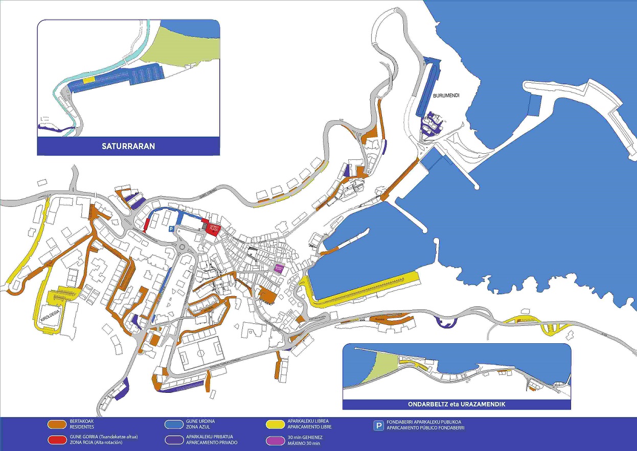 Las zonas amarillas serán de estacionamiento libre y en ellas se incluyen una decena de plazas en Saturraran, Olatz Bidea, y los aparcamientos del polideportivo y el puerto. También será libre estacionar en Ondarbeltz y en el paseo que llega hasta Alkolea.