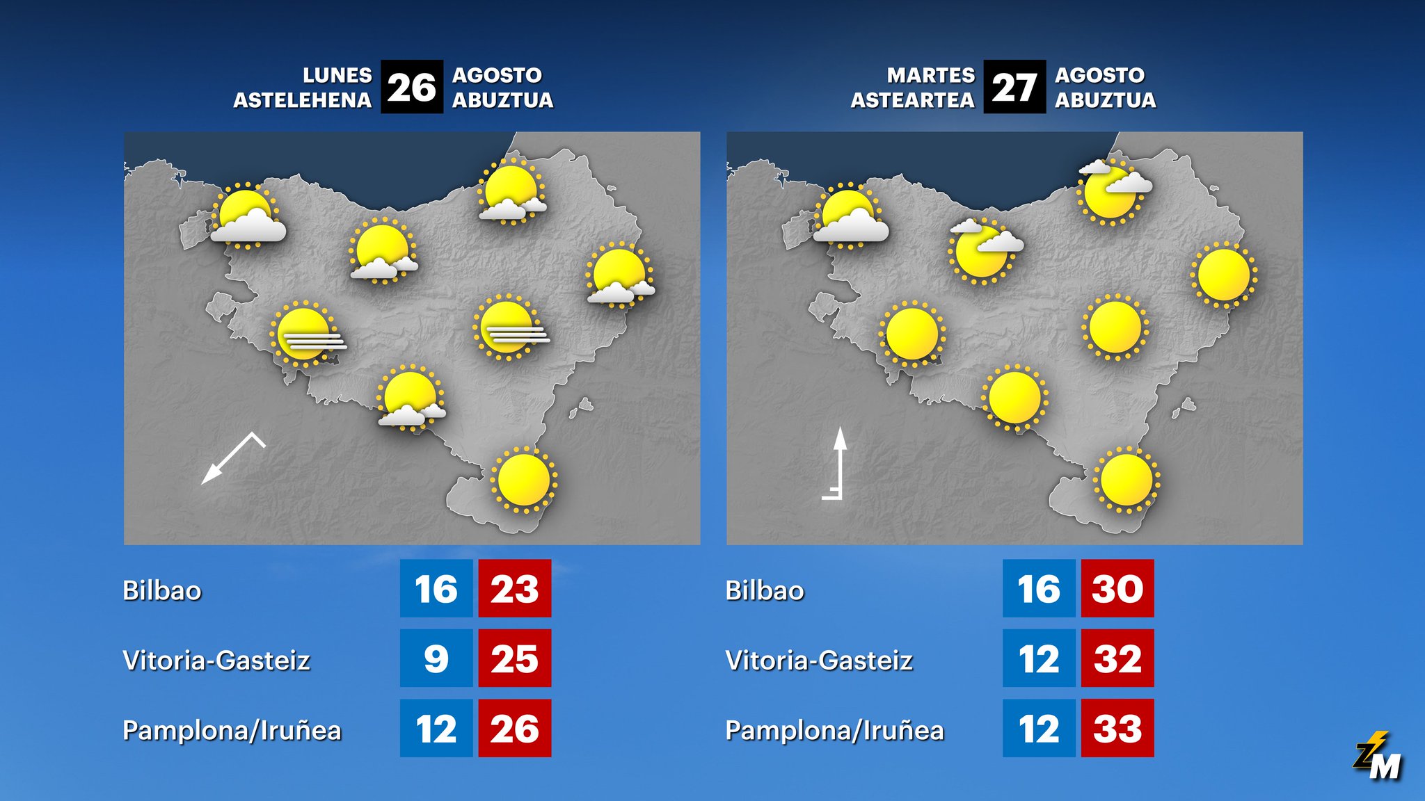 Las temperaturas diurnas volverán a subir el martes y las máximas volverán a ser veraniegas, incluso algo calurosas en el interior. También subirán las temperaturas mínimas. Cielo poco nuboso o despejado, con algunas nubes medias y altas. En el norte también aparecerán algunas nubes bajas, especialmente al final del día. Viento sur a primeras horas, con brisa al mediodía en el litoral; por la tarde pasará a soplar del norte en el interior y del oeste en la costa.