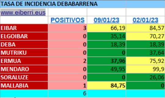 DEBABARRENA | Según los últimos datos públicados por Osakidetza la situación sigue mejorando con seis de las ocho localidad en verde. Tan solo dos están en amarillo, Eibar y Mallabia. La semana pasada se contabilizaron seis casos frente a los 27 de la anterior.