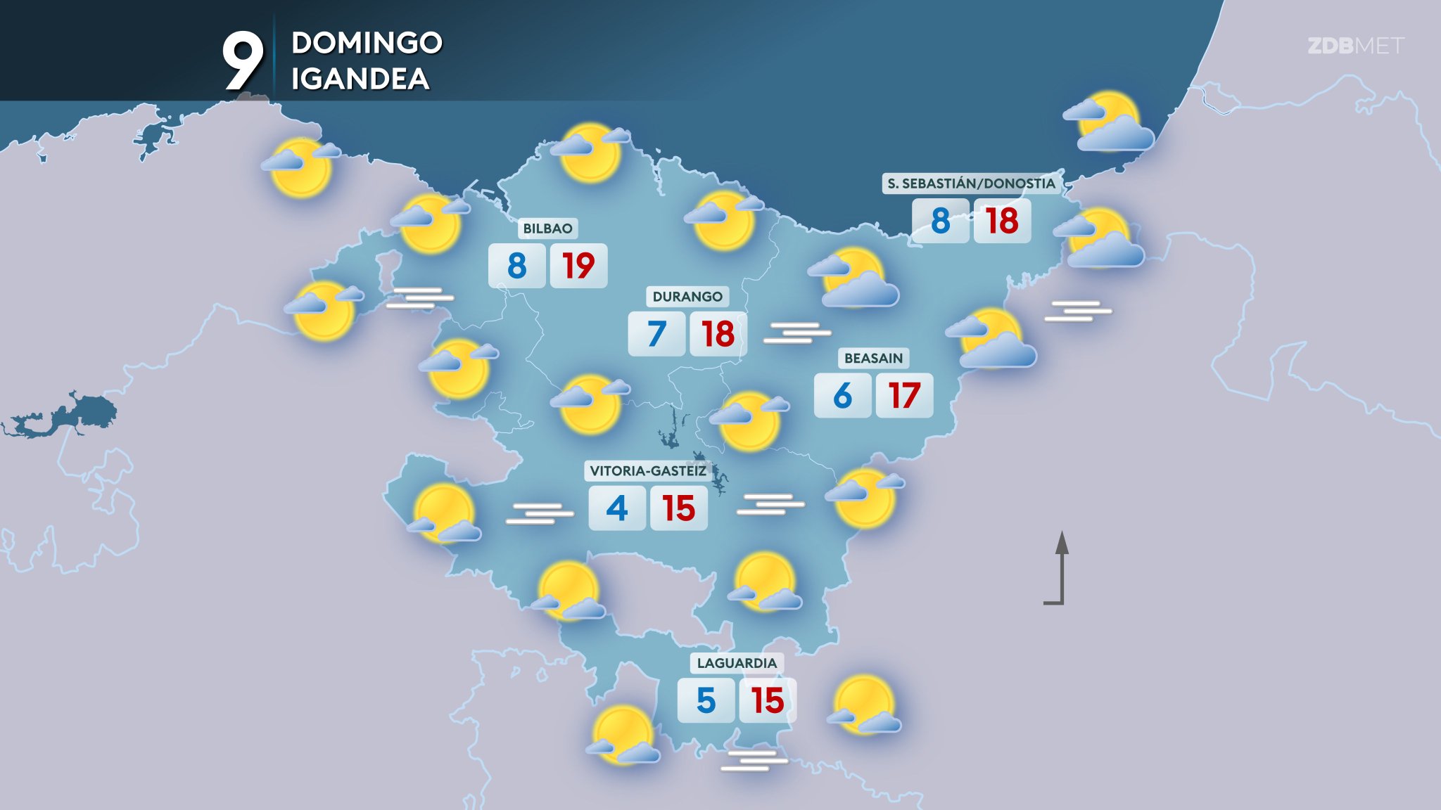 EGURALDIA | El domingo disfrutaremos de un tiempo tranquilo y agradable. La lluvia remitirá, aunque no se descarta, algún chubasco débil y aislado de madrugada en el nordeste. El viento perderá intensidad y soplará flojo del sur durante la jornada. A primeras horas podrá haber nieblas en algunos valles del interior, pero durante la mañana los cielos estarán poco nubosos; por la tarde aumentará la nubosidad con la llegada de nubes medias y altas. Las temperaturas serán frías al amanecer, con posibilidad de heladas en zonas de Álava y Navarra, mientras que las máximas experimentarán un ascenso respecto al día anterior