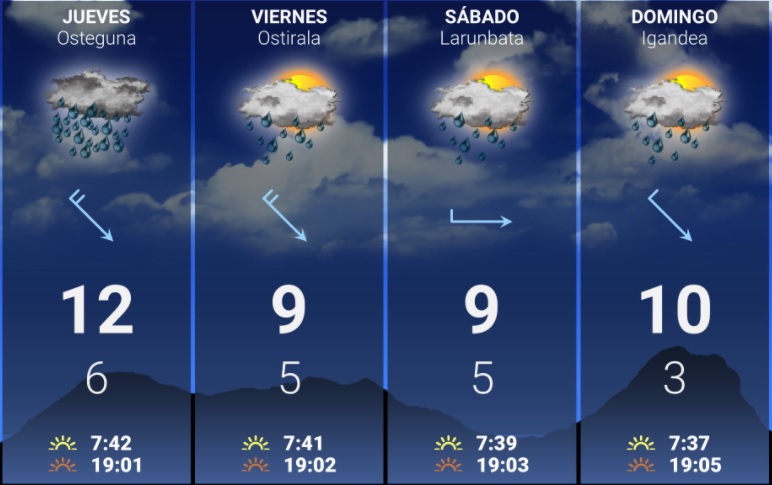 EGURALDIA | Hoy miércoles descenso de las temperaturas y precipitaciones. El frente que nos atravesará dejara los cielos cubiertos y precipitaciones, que serán más probables durante la primera mitad del día. A medida que avance la tarde, las precipitaciones irán remitiendo y se abrirán algunos claros. Viento de componente oeste, que se fijará del sur por la tarde-noche. Las temperaturas máximas bajarán hasta valores cercanos a los 12-14 grados.