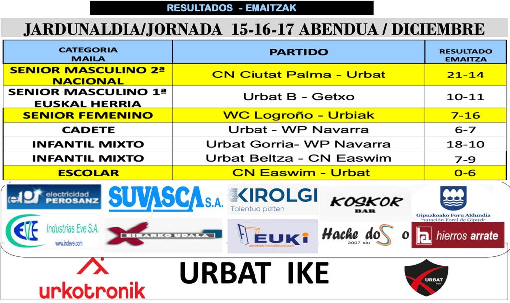 Ostiral gauean Euskal Herriko lehen mailan senior B-k galdu egin zuen Getxoren aurkako 10-11ko partida parekatu baten ondoren. Larunbat eguerdian haurren Urbat Gorriak 18-10 gainditu zuen Waterpolo Navarra eta ordu batzuk geroago kadeteak Nafarroaren aurka 6-7 galtzen zuen azken minutuan.